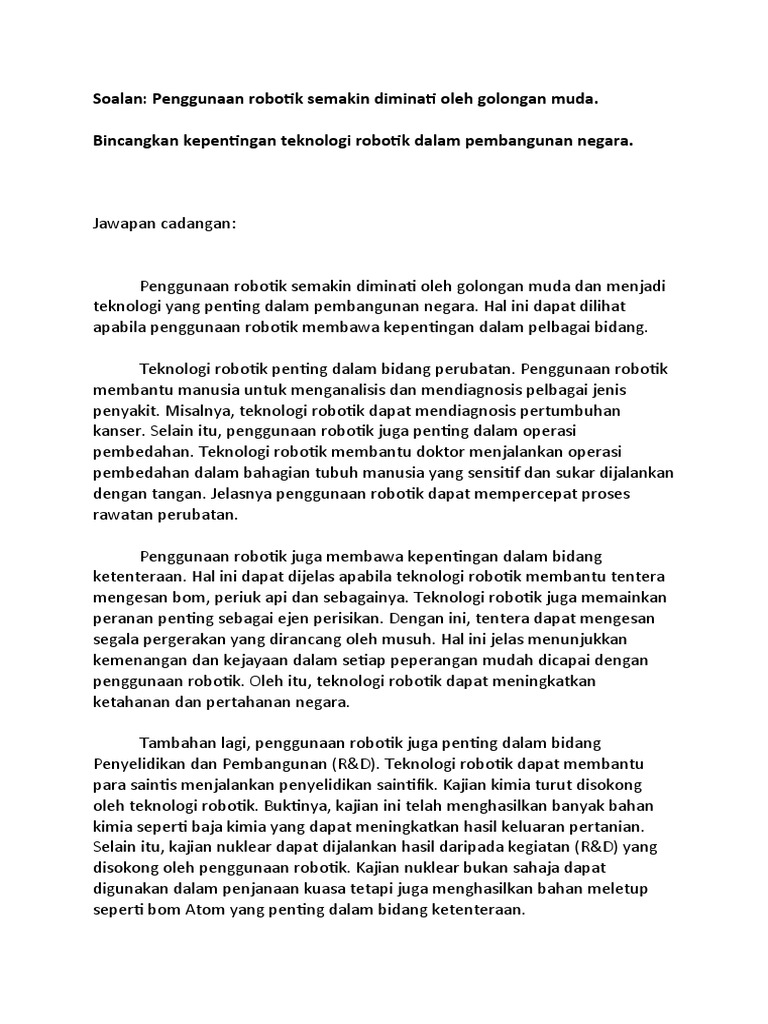 Robot menurut Kamus Pelajar Edisi Keempat Dewan Bahasa dan Pustaka 2005 adalah mesin yang dapat melakukan atau membuat berbagai-bagai. Pencipta ku hanyalah seorang lelaki kampung yang tinggal di solok pendalaman sebuah kampung yang memang tidak urban habis. Panjang karangan anda hendaklah antara 200 hingga 250 patah perkataan.